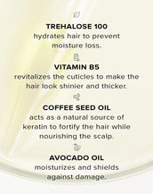 - Vita-Seal™ Complex preserves the hair’s integrity and prevents future breakage. It comprises a proprietary blend of nutrients and vitamins: Trehalose 100:hydrates hair to prevent moisture loss. Vitamin B5: seals the cuticles, making the hair look shinier and thicker. Coffee Seed Oil: acts as a natural source of keratin to fortify the hair while nourishing the scalp. Avocado Oil: moisturizes and shields against damage.