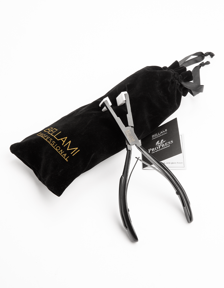 ProPress - Tape-In installations are getting a superior upgrade with the new and improved BELLAMI ProPress. Made from sturdy stainless steel, the ProPress is rust, fade and transfer-resistant. Upgraded silicone handles give a better grip and more comfort during Tape-In installation. It’s luxe matte black coating adds style while preventing glare from salon lighting.